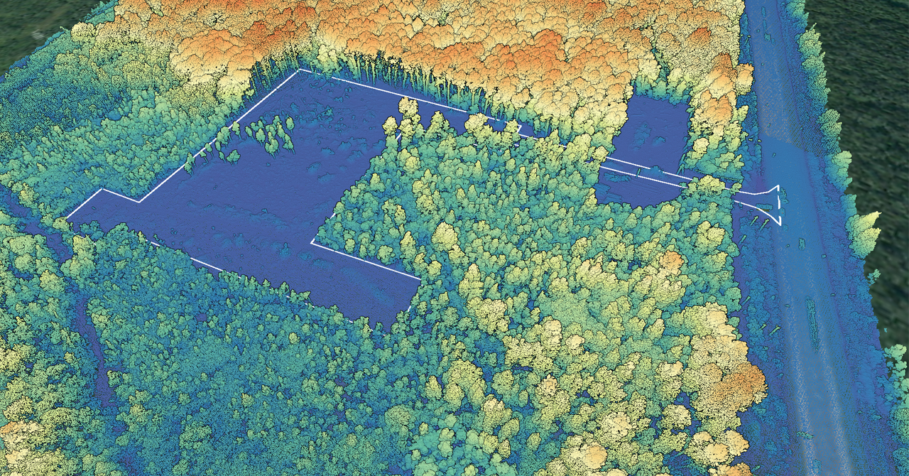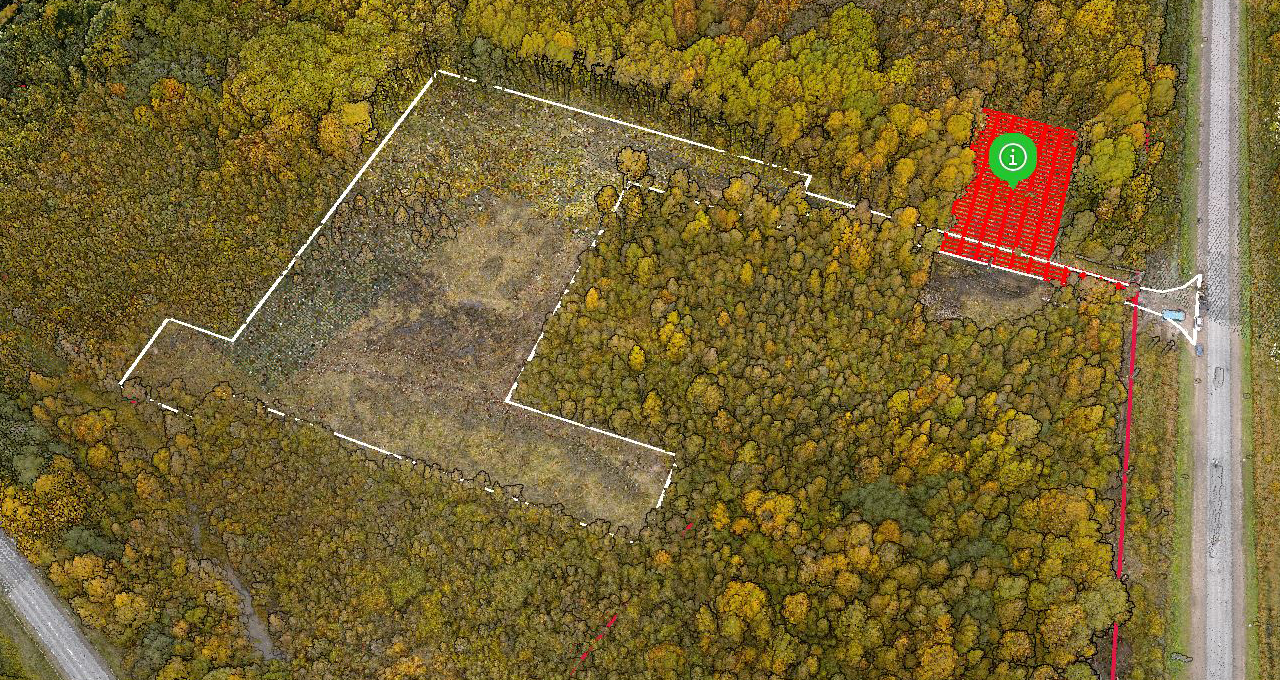 Пример визуализации данных. Общий вид данных, полученных после рубки леса с наложенной границей рубки. (Данные с целью контроля доклада подрядной организации по рубке об окончании работ)