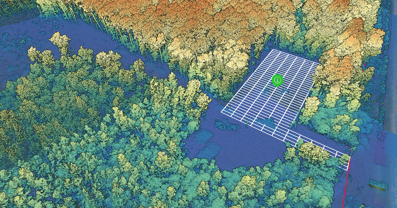 Общий вид одного из участков мониторинга: на сцену с облаком точек загружены векторные данные по кадастру, граница работ по рубке и проектное положение раскладки плит для временного строительного городка