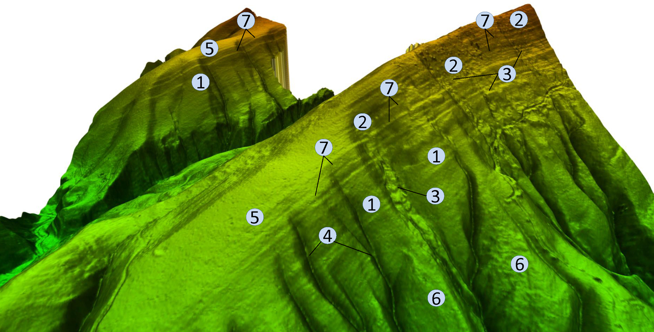 Описание инженерно-геологических условий по данным воздушного лазерного сканирования при проведении инженерных изысканий (1 – горные склоны; 2 – осыпи; 3 – ложбины движения осыпей; 4 – эрозионные врезы; 5 – приводораздельные склоны покрытые чехлом; 6 – склоны покрытые чехлом; 7 – переслаивание коренных пород).